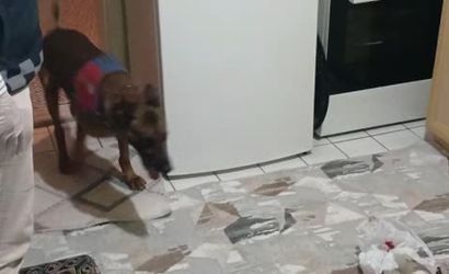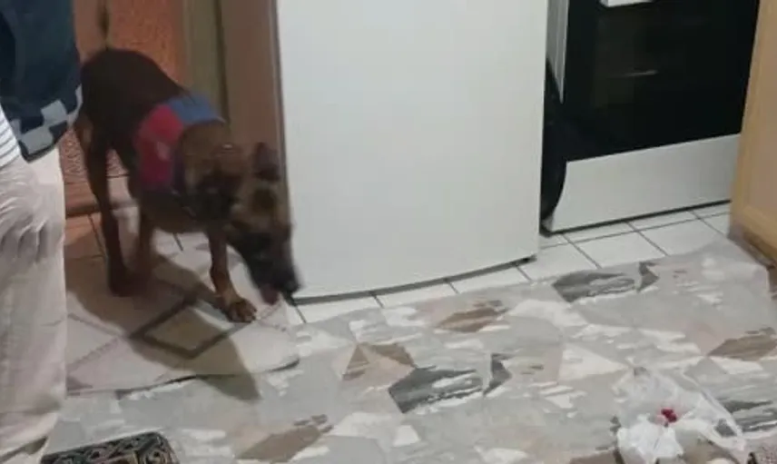 Arama sırasında görevli narkotik köpeği Yalman, burnuyla yaptığı tespit sonucu mutfak dolabındaki uyuşturucu maddelerin yerini belirledi ve patisiyle jandarma ekiplerine işaret etti.