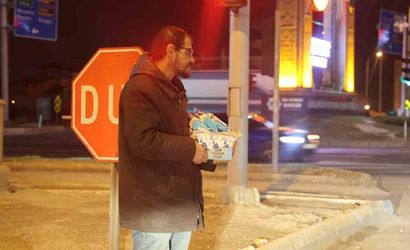 AKSARAY'DA ELİNDEKİ MENDİL KUTUSUYLA KARAYOLLARINDAKİ IŞIKLI KAVŞAKLARA ÇIKARAK SATIŞ YAPAN 42 YAŞINDAKİ ADAM, GECE BOYUNCA SÜRÜCÜ VE YOLCULARA MENDİL SATARAK KAZANÇ SAĞLAMAYA ÇALIŞIYOR.