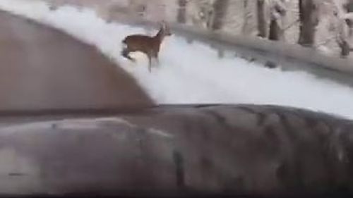 Akyazı'da Güzlek Mahallesi yakınlarında kar keyfi yapan ailenin, karlı yola inen karaca ile karşılaşması aile tarafından saniye saniye görüntülendi.