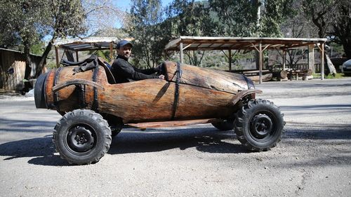 Alanyalı marangoz Adem Say, kütükten yaptığı motorlu aracıyla çocukluk hayalini gerçeğe dönüştürdü. Araç 300 bin liraya mal oldu.