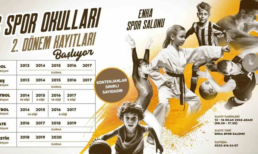 ENKA Spor Salonu için kayıtlar 12-16 Ocak 2026 tarihlerinde, 08.30-17.30 saatleri arasında ENKA Spor Salonu'nda yapılacaktır. Detaylı bilgi için 0232 616 54 07 numaralı telefon aranabilir.