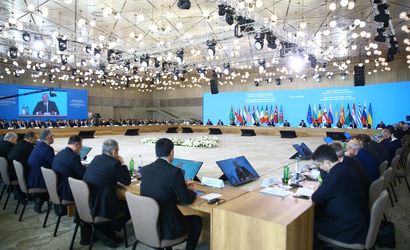Azerbaycan Cumhurbaşkanı İlham Aliyev (ortada), Bakü'de düzenlenen Güney Gaz Koridoru 11. Danışma Kurulu ve Yeşil Enerji Danışma Konseyi 3. Bakanlar toplantısında konuşma yaptı.