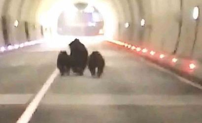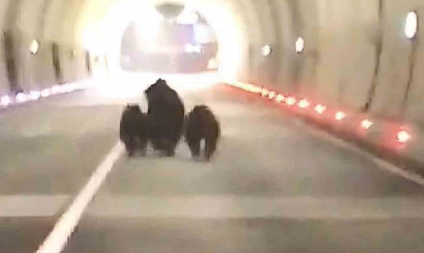 Bartın’ın Amasra ilçesi girişinde yer alan 1100 metrelik tünelde gece saatlerinde bir anne ayı ve iki yavru görüldü. Ayılar, aracın farlarını fark edince tünele doğru koşarak girdi ve tünelin bir ucundan diğer ucuna kadar ilerledi.