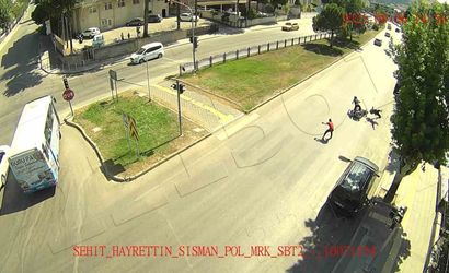 Eski otogar mevkiinde kaydedilen bir başka görüntüde, yaya geçidinden geçen iki kişiden birine hızla gelen motosiklet çarptı. Kazada yaya ile motosiklet sürücüsünün metrelerce sürüklendiği anlar KGYS kayıtlarına yansıdı.