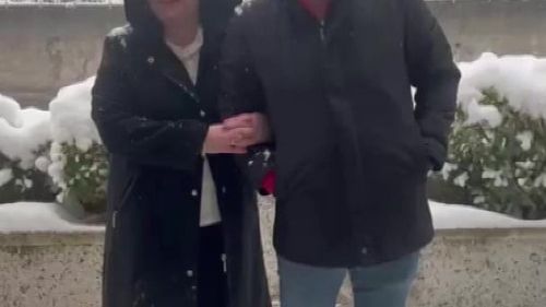 Amasya'da otel tentesi altına selfie çekmeye geçen Öztürk çiftinin üzerine, görevlilerin müdahalesiyle hareketlenen kar kütlesi aniden düştü.