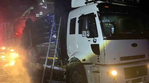 Amasya Merzifon'da plastik halı yüklü 28 EG 565 plakalı kamyon seyir halindeyken yanarak büyük hasar gördü; polis ve itfaiye müdahale etti, soruşturma başlatıldı.