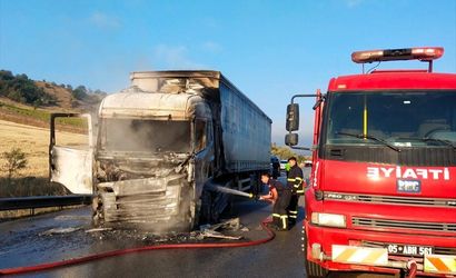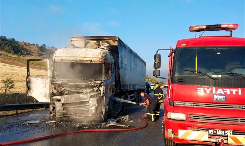 Yangın, sürücünün yaptığı ihbar sonucunda bölgeye sevk edilen jandarma ve itfaiye ekipleri tarafından kontrol altına alındı. İtfaiyenin müdahalesiyle söndürülen yangında, tırın sürücü kabini de dahil olmak üzere ön kısmı tamamen yanarak kullanılmaz hale geldi.