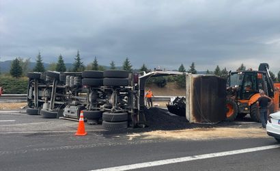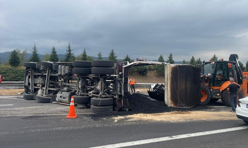 Anadolu Otoyolu'nun Bolu Dağı Tüneli kesiminde, plakası ve sürücüsünün ismi öğrenilemeyen asfalt yüklü kamyon 1. viyadük mevkiinde devrildi.
