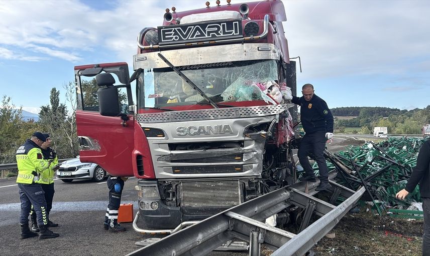 Anadolu Otoyolu'nun Bolu kesiminde tırın bariyere çarpması sonucu sürücü yaralandı. Sağlık ekipleri, yaralı sürücüye ilk müdahaleyi sıkıştığı tırın içinde yaptı.