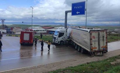 Ankara Ayaş Yolu sanayi girişi mevkiinde meydana gelen kazada, yağışlı hava nedeniyle kayganlaşan yolda seyir halindeki bir tır kontrolden çıkarak orta refüje çarptı.