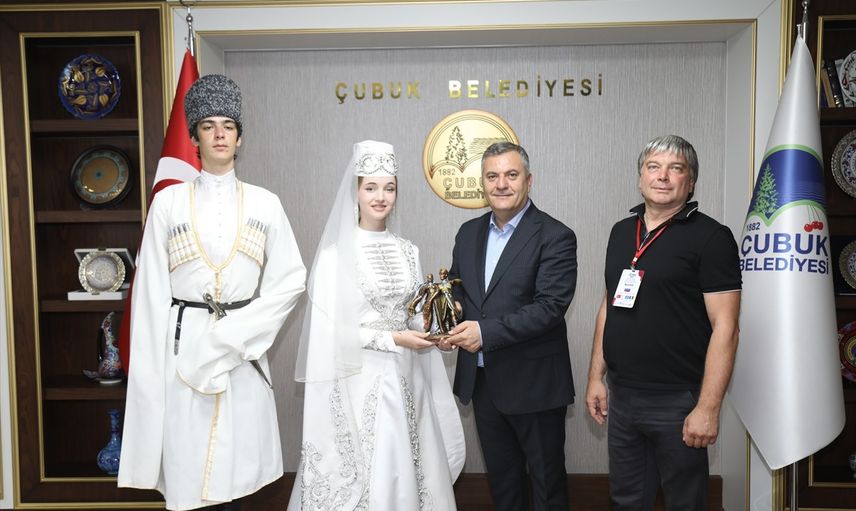 Ankara'da Çubuk Belediyesince bu yıl 17'ncisi organize edilen Uluslararası Çubuk Kültür ve Turşu Festivali, yarın başlayacak. Festival için Rusya, Kosova, Romanya, Kuzey Kıbrıs Türk Cumhuriyeti, Bosna Hersek ve Gaziantep'ten gelen dans toplulukları, Çubuk Belediye Başkanı Baki Demirbaş'ı (ortada) ziyaret etti.