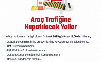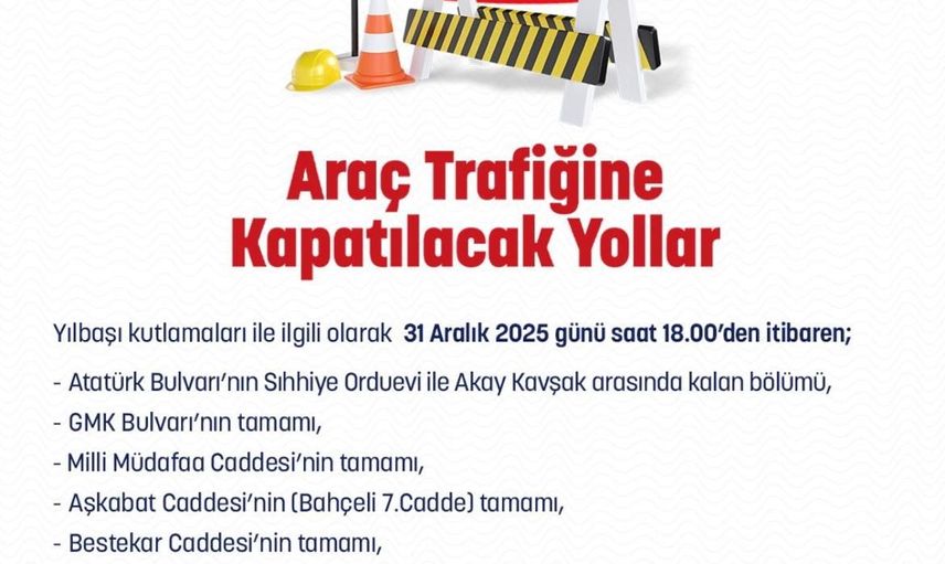 "Yılbaşı kutlamaları ile ilgili olarak 31 Aralık 2025 günü saat 18.00’den itibaren; Atatürk Bulvarı’nın Sıhhiye Orduevi ile Akay Kavşak arasında kalan bölümü, GMK Bulvarı’nın tamamı, Milli Müdafaa Caddesi’nin tamamı, Aşkabat Caddesi’nin (Bahçeli 7.Cadde) tamamı, Bestekar Caddesi’nin tamamı, Kızılırmak Caddesi’nin tamamı, Olgunlar Caddesi’nin tamamı, Selanik Caddesi’nin tamamı, Tunalı Hilmi Caddesi’nin tamamı, Azerbaycan Caddesi’nin (Bahçeli 3.Cadde) tamamı, Yüksel Caddesi’nin tamamı, Sakarya Caddesi’nin tamamı, Kumrular Caddesi’nin tamamı, Tunus Caddesi’nin tamamı, Tuna Caddesi’nin tamamı, Ziya Gökalp Caddesi’nin Kolej Kavsak ile Kızılay Kavsak arasında kalan bölümü, İnkılap Sokağı’nın tamamı, Konur Sokağı’nın tamamı, Karanfil Sokağı’nın tamamı, Bilge Sokağı’nın tamamı, Bülten Sokağı’nın tamamı, Çığır Sokağı’nın tamamı, Bayındır Sokağı’nın tamamı, ihtiyaç olması halinde; Oğuzhan Asiltürk Caddesi’nin tamamı, Meşrutiyet Caddesi’nin tamamı, Filistin Caddesi’nin tamamı, Polonya Caddesi’nin tamamı, İran Caddesi’nin tamamı, Arjantin Caddesi’nin tamamı, Kuleli Caddesi’nin tamamı programlar sona erene kadar trafiğe kapatılacaktır. Kamuoyuna saygıyla duyurulur."