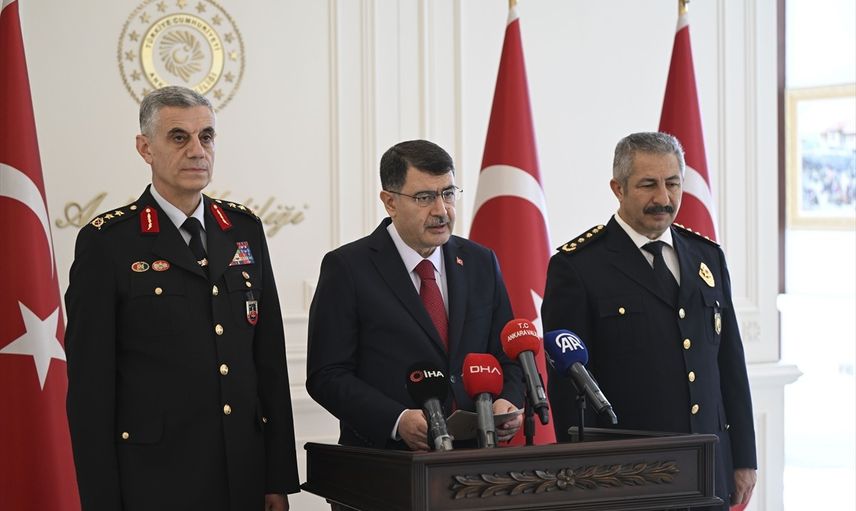 Ankara Valisi Vasip Şahin (ortada), Valilik Binası'nda, Başkent genelinde Kurban Bayramı tatili boyunca uygulanacak denetimler ve güvenlik önlemleriyle ilgili açıklamalarda bulundu. Programda, Ankara İl Emniyet Müdürü Engin Dinç (sağda) ve İl Jandarma Komutanı Recep Yalçınkaya (solda) da yer aldı.
