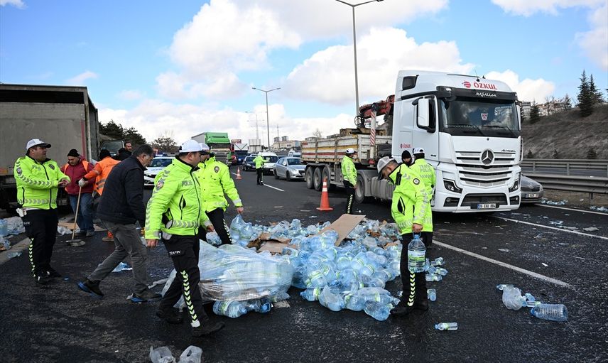 Ankara'da 4 aracın karıştığı zincirleme trafik kazası meydana geldi. Ankara Çevreyolu, Pursaklar istikametinde seyreden İbrahim D. idaresindeki su yüklü kamyon, sürücüsünün direksiyon hakimiyetini kaybetmesiyle devrildi. Kaza sonucu yaralanan olmazken, 4 araçta hasar oluştu. Kamyondan yola savrulan su şişeleri, Karayolları ve trafik ekiplerince toplandı.