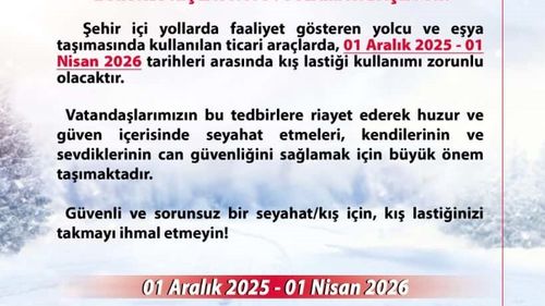 Ankara Valiliği, şehir içi yolcu ve eşya taşıyan ticari araçlarda 1 Aralık 2025-1 Nisan 2026 arasında kış lastiği kullanımını zorunlu ilan etti.