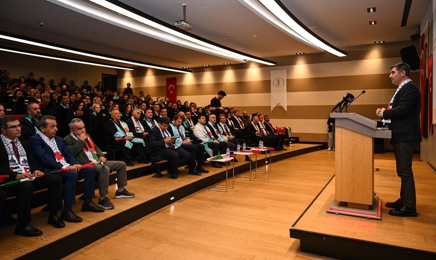 Üniversite Rektörü Prof. Dr. Erhan Özden, törendeki konuşmasında Filistin’de yaşananların insanlık vicdanını derinden yaraladığını vurguladı. Özden, konuşmasında şu ifadeleri kullandı: "100 bine yakın canı kaybettik. Bebek, çocuk, genç, yaşlı, kadın demeden, tamamen insani melekelerini kaybetmiş bir topluluğun, bir grubun karşı tarafı acımasızca yok etme düşüncesiyle, her türlü vahşi aracı kullandığı bir katliamla karşı karşıyayız."