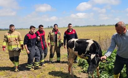 Hatay’ın Antakya ilçesi Apaydın Mahallesi sınırlarında otlarken sulama kanalına düşen inek, mahsur kaldı. İneğin çırpınışını gören sahibi durumu 112 Acil Çağrı Merkezi'ne bildirdi.