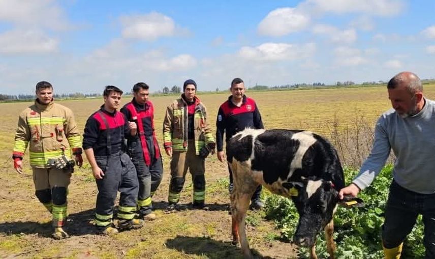 Sulama kanalından çıkarılan inek, ekiplerin müdahalesinin ardından sahibine teslim edildi.