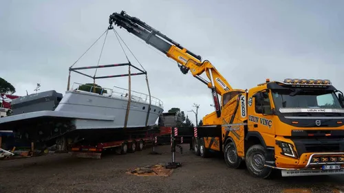 Aksu'da metrekareye 190 kilogramı aşkın yağış sonrası hortumda zarar gören tekneler, vinç ve kepçelerle onarım için güvenli alana taşınıyor.