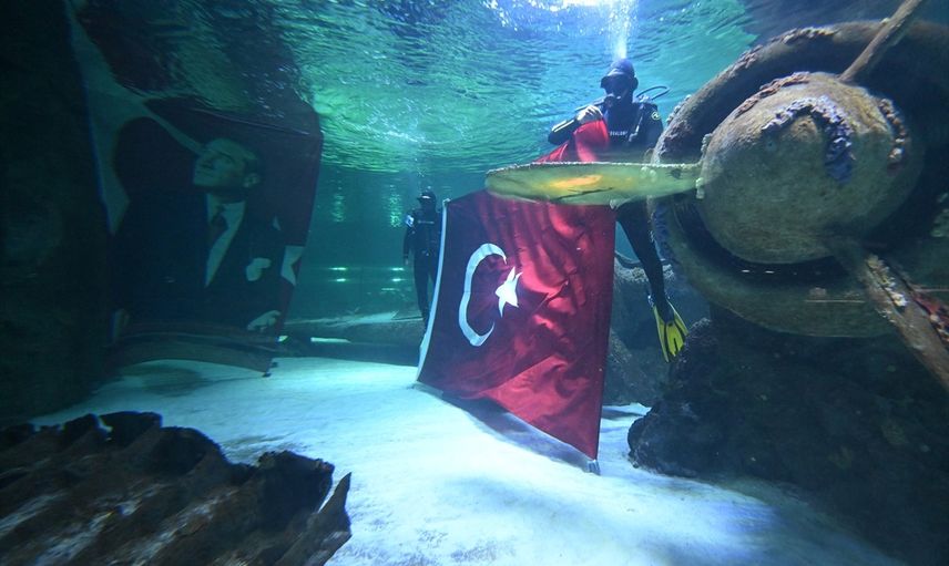 Dalgıçlar, tank temizliği, bakım ve onarım gibi rutin işlerinin yanı sıra bu özel gün için dalış gerçekleştirdiler. Ana tankta yer alan köpek balıklarının arasında dalarken, yanlarına aldıkları Türk bayrağı ile tank içerisindeki batık uçak dekorunun önünde poz verdiler. Dalgıçlar, dalış öncesi gerekli güvenlik önlemlerini aldı.