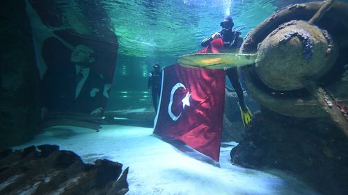Antalya Akvaryum'da dalgıçlar, 30 Ağustos Zafer Bayramı'nı köpek balıklarıyla birlikte Türk bayrağı açarak kutladı.
