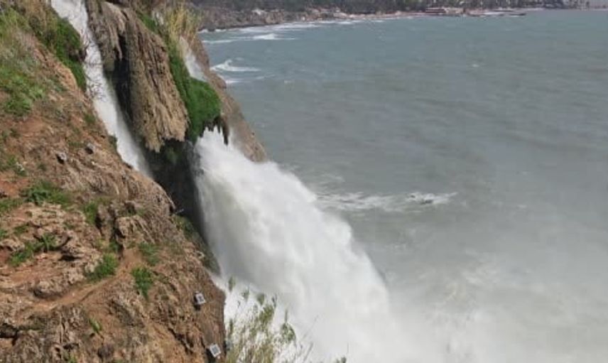 Dün akşam saatlerinde etkisini gösteren şiddetli yağış, şelalenin debisini ve suyunun rengini değiştirdi. Yağmurla birlikte yüksek kesimlerden taşınan toprak ve sediment, Düden Şelalesi aracılığıyla Akdeniz'e ulaştı; falezler boyunca masmavi suların yerini çamur rengi aldı.