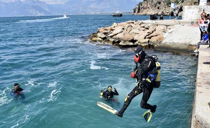 Antalya'da 35 dalgıç, gönüllü olarak Kaleiçi Yat Limanı'nda dalış yaparak deniz dibindeki atıkları çıkardı. Polisler temizliğe yardım etti.