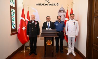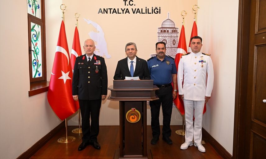 Antalya Valisi Hulusi Şahin (sol 2), valilikte düzenlenen İl Asayiş ve Güvenlik Bilgilendirme Toplantısı'nda, kentteki haziran ayı asayiş olayları ve orman yangınlarıyla mücadele hakkında bilgi verdi. Toplantıya İl Jandarma Komutanı Tarık Hekimoğlu (solda), Sahil Güvenlik Antalya Grup Komutanı Tolga Coşkun (sağda) ve İl Emniyet Müdürü İlker Arslan (sağ 2) da katıldı.