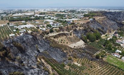 Antalya'nın Aksu ilçesinde, Kurşunlu Mahallesi'nde önceki gün çıkan ve Perge Antik Kenti'ne yaklaşan yangın alanları dronla görüntülendi. Bu görüntülerde, yangın sonrası yeşil alanların siyah renge dönüştüğü gözlemlenmiştir.
