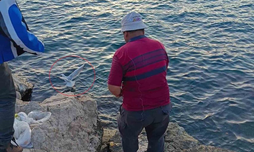 Meydana gelen temas sonucu kanadına iğne takılan martı suya düştü. O anı gören balıkçı, şaşkınlık içinde oltayı kıyıya çekti ve martıyı sudan çıkardı.