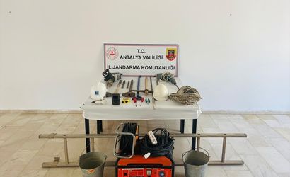 Antalya'nın Serik ilçesinde izinsiz kazı yapan 4 şüpheli, gözaltına alındı. Aramada, jeneratör, 2 delici alet, fotokapan, 2 baret, çapa, balyoz, kazma, 5 metre seyyar lamba, 20 metre ip, 50 metre seyyar elektrik kablosu, 7 delici makine ucu, pense, tornavida, merdiven ve 2 kova bulundu.