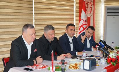 Antalyaspor Kulübü Başkanı Mustafa Ergün (sağ 2), Atilla Vehbi Konuk Tesisleri'nde gazetecilerle bir araya geldi. Ergün, burada açıklamalarda bulundu.