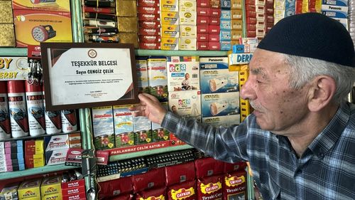 Ardahan'da 57 yıldır bakkal işleten Cengiz Çelik'e düzen ve temizliği nedeniyle teşekkür belgesi