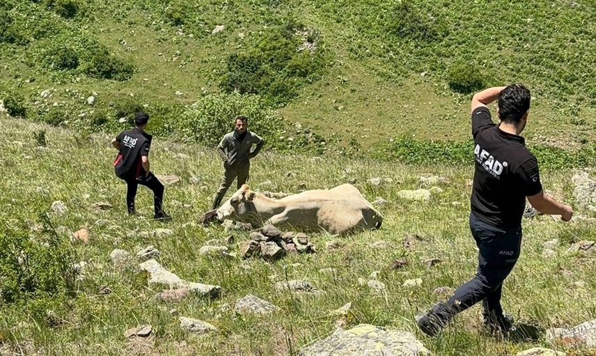 Olay yerine gelen Afet ve Acil Durum Müdürlüğü (AFAD) ekipleri, yaralı hayvanı kurtarmak için harekete geçti. Ekipler, vatandaşların yardımıyla traktöre bağlanan halat kullanarak, büyükbaş hayvanı düştüğü yerden çıkartmayı başardı.