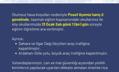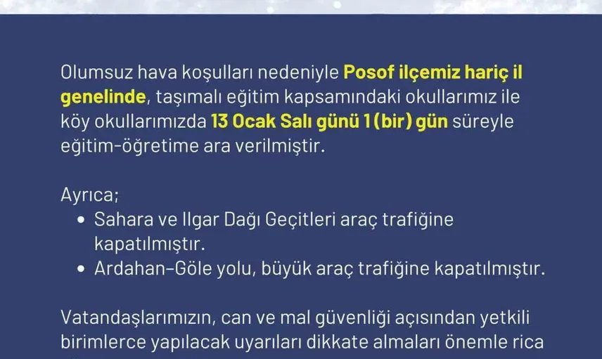 ’’Olumsuz hava koşulları nedeniyle Posof ilçemiz hariç il genelinde, taşımalı eğitim kapsamındaki okullarımız ile köy okullarımızda 13 Ocak Salı günü 1 (bir) gün süreyle eğitim-öğretime ara verilmiştir.