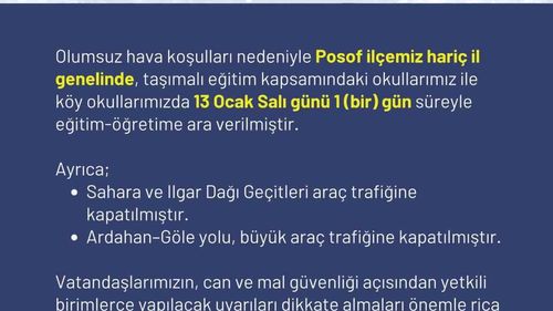 Ardahan Valiliği: Posof hariç il genelinde 13 Ocak Salı taşımalı ve köy okullarında eğitim-öğretime bir gün ara verildi; bazı geçit ve yollar trafiğe kapatıldı.
