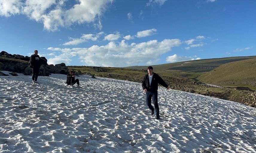 Sıcak havadan bunalanlar, Ardahan'daki karlı zirvelerde serinlemenin keyfini yaşıyor. Ziyaretçiler, yaylada hala karla kaplı noktalara çıkarak kar üstünde geziyor.