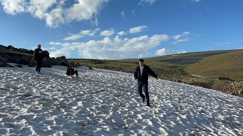 Sıcak havalardan bunalanlar, Ardahan'ın yüksek ve karlı yaylalarında serinlemenin tadını çıkarıyor.