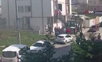 İş makinesinin kepçesine atlayarak camlardan indirilen vatandaşlar, kepçe ile güvenli şekilde yere ulaştırıldı. Kurtarma anları, çevredeki bir kişinin cep telefonu kamerasına saniye saniye yansıdı.