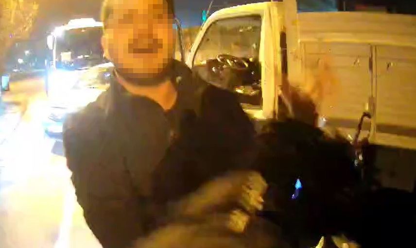 Edinilen bilgiye göre, trafikte ilerleyen motosiklet sürücüsüyle bir kamyonet şoförü arasında yol meselesi nedeniyle tartışma çıktı. Tartışma kısa sürede büyüdü ve kamyonet şoförü aracını durdurdu. Kamyonet şofürü, "Canım sıkkın, gider misin?" dedi ve kabinden dışarı eğilerek motosiklet sürücüsüne yumruk attı, ardından tekme savurdu.