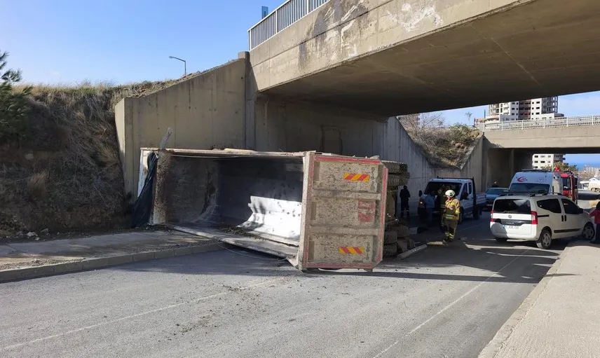 Hatay'ın Arsuz ilçesi Nardüzü Mahallesi'nde sürücüsünün kontrolünü kaybetmesi sonucu hafriyat kamyonu devrildi. Olay, bölgedeki trafik akışını etkiledi ve müdahaleye neden oldu.