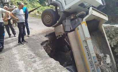 Artvin'in Arhavi ilçesinde heyelan nedeniyle kapanan yolda yapılan onarım çalışmaları sırasında yolun çökmesiyle oluşan çukura düşen kamyonun sürücüsü yaralandı.