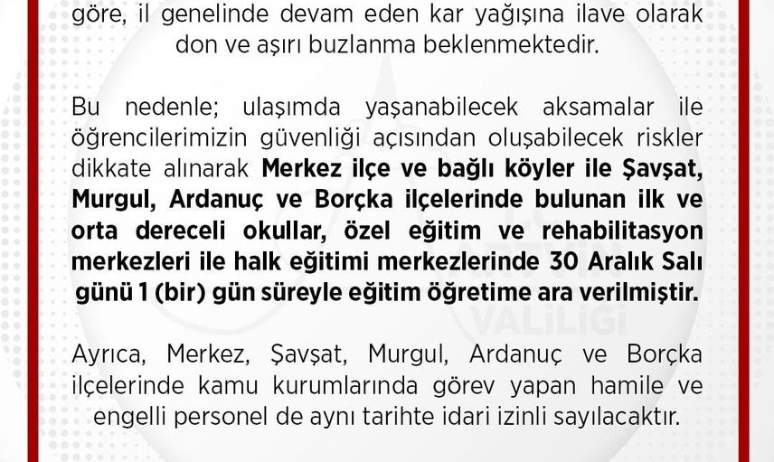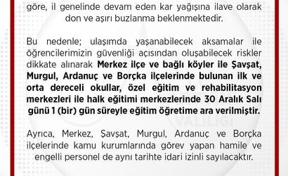30 Aralık Salı günü Artvin merkez ilçe ve bağlı köyler ile Şavşat, Murgul, Ardanuç ve Borçka ilçelerinde bulunan ilk ve orta dereceli okullar, özel eğitim ve rehabilitasyon merkezleri ile halk eğitim merkezleri eğitim öğretime bir gün süreyle ara verildi.