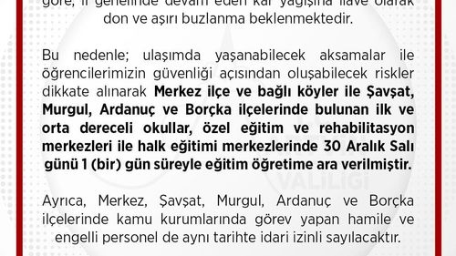 Artvin'de Meteoroloji uyarısı üzerine Artvin merkez ile Şavşat, Murgul, Ardanuç ve Borçka'da 30 Aralık Salı okullar 1 gün tatil; hamile ve engelli personel idari izinli.