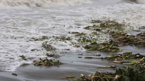 Hatay'da şiddetli yağış Asi Nehri'ndeki istilacı su sümbüllerini Akdeniz'e taşıdı; Samandağ sahili yeşile döndü.