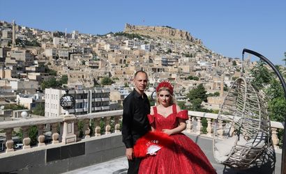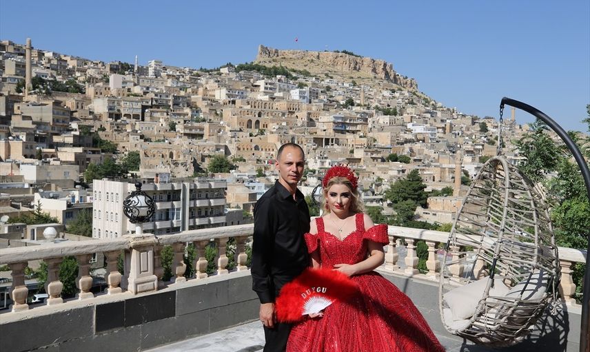 Mardin'de dünyaevine giren çiftler, düğün fotoğraflarının çekimini stüdyo yerine bunaltıcı sıcaklara rağmen açık alanlarda yapıyor. Termometrelerin zaman zaman 40 derecenin üzerini gösterdiği Mardin, gelin ve damatlara nişan, kına ve düğün fotoğrafı çekimi için yaz aylarında da doğal stüdyo oluyor.