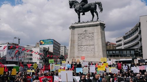 Atama bekleyen öğretmenler, yetersiz alımlara karşı Ulus Zafer Anıtı önünde açıklama yaptı. Destekleyen siyasetçiler ve sendika temsilcileri de vardı.