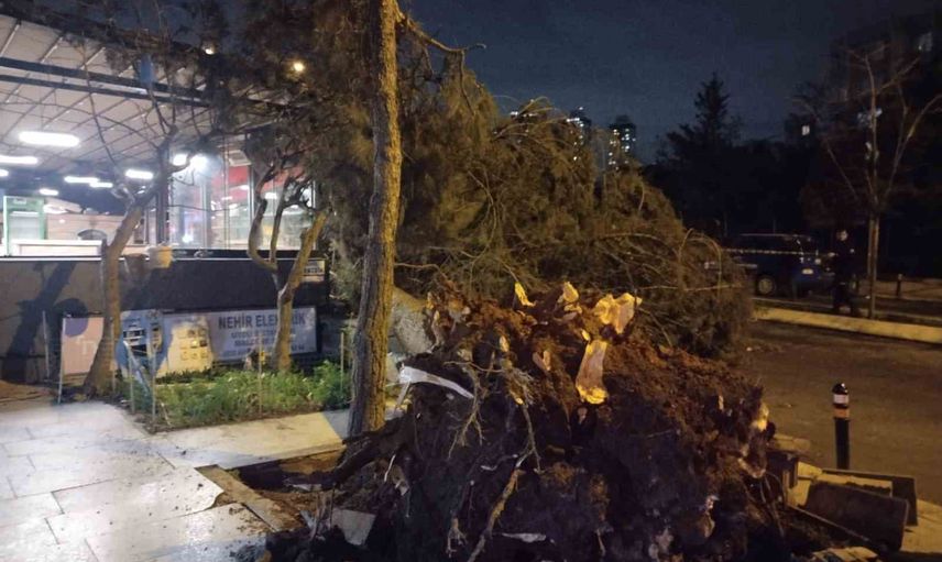 İhbar üzerine olay yerine itfaiye, polis ve sağlık ekipleri sevk edildi. Devrilen ağaç, bir restoranın tente kısmına zarar verirken, yol kenarında park halindeki bir otomobilin üzerine düştü.