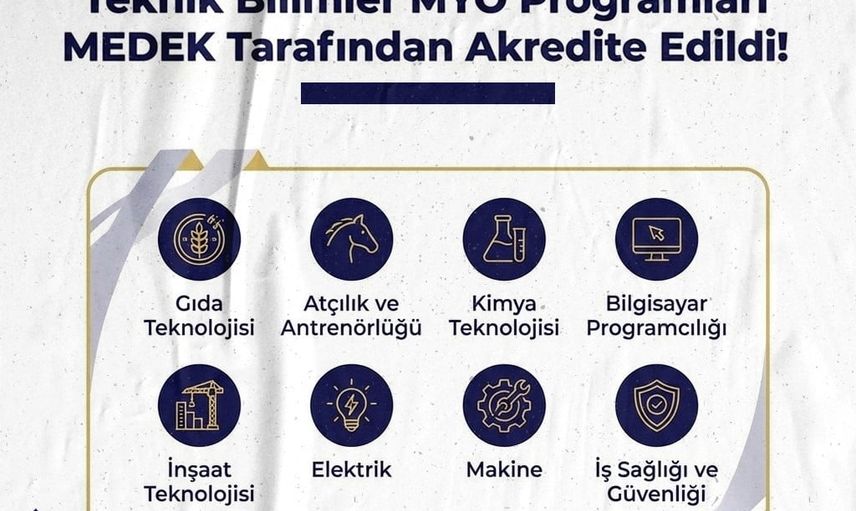 TEKNİK BİLİMLER MESLEK YÜKSEKOKULU BÜNYESİNDE YER ALAN GIDA TEKNOLOJİSİ, ATÇILIK VE ANTRENÖRLÜĞÜ, KİMYA TEKNOLOJİSİ, BİLGİSAYAR PROGRAMCILIĞI, İNŞAAT TEKNOLOJİSİ, ELEKTRİK, MAKİNE İLE İŞ SAĞLIĞI VE GÜVENLİĞİ PROGRAMLARI, MESLEKİ EĞİTİM DEĞERLENDİRME VE AKREDİTASYON DERNEĞİ (MEDEK) TARAFINDAN AKREDİTE EDİLDİ.