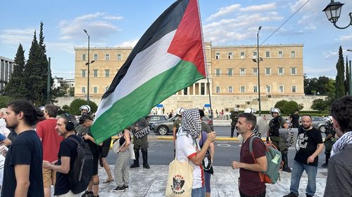 Atina'da yapılan eylemde, Filistin'e destek amaçlı protestolar gerçekleştirildi ve İsrail'in saldırıları protesto edildi.